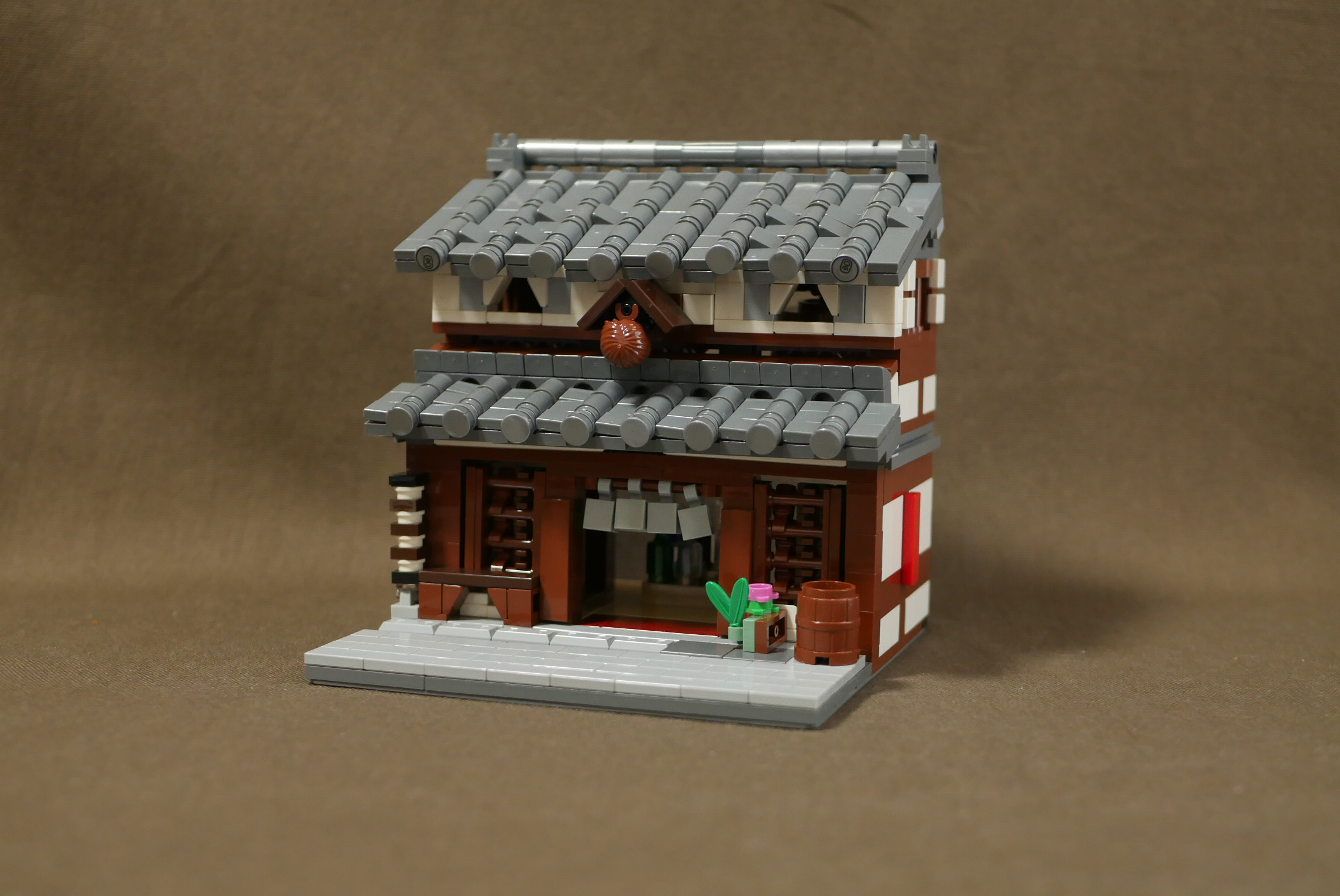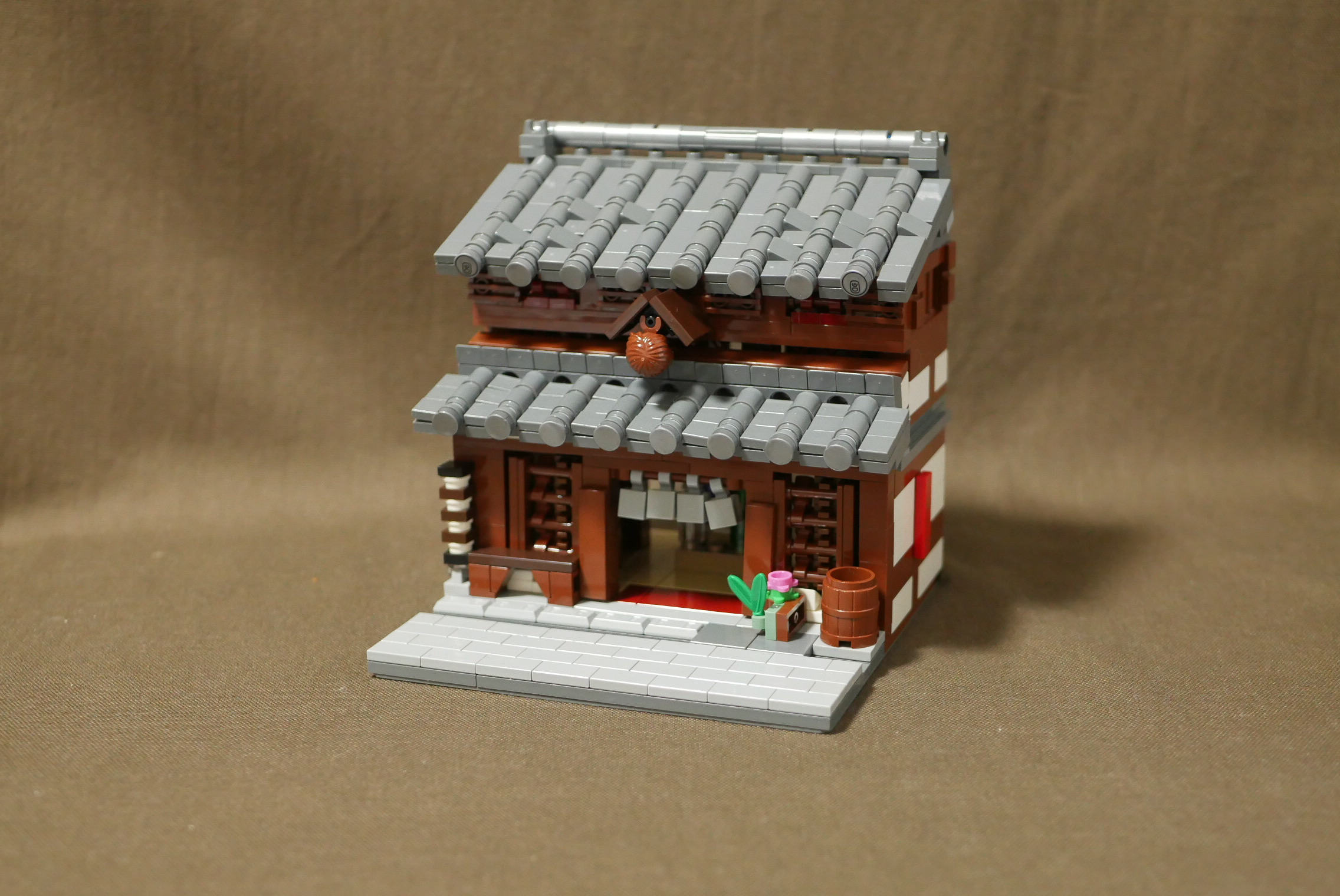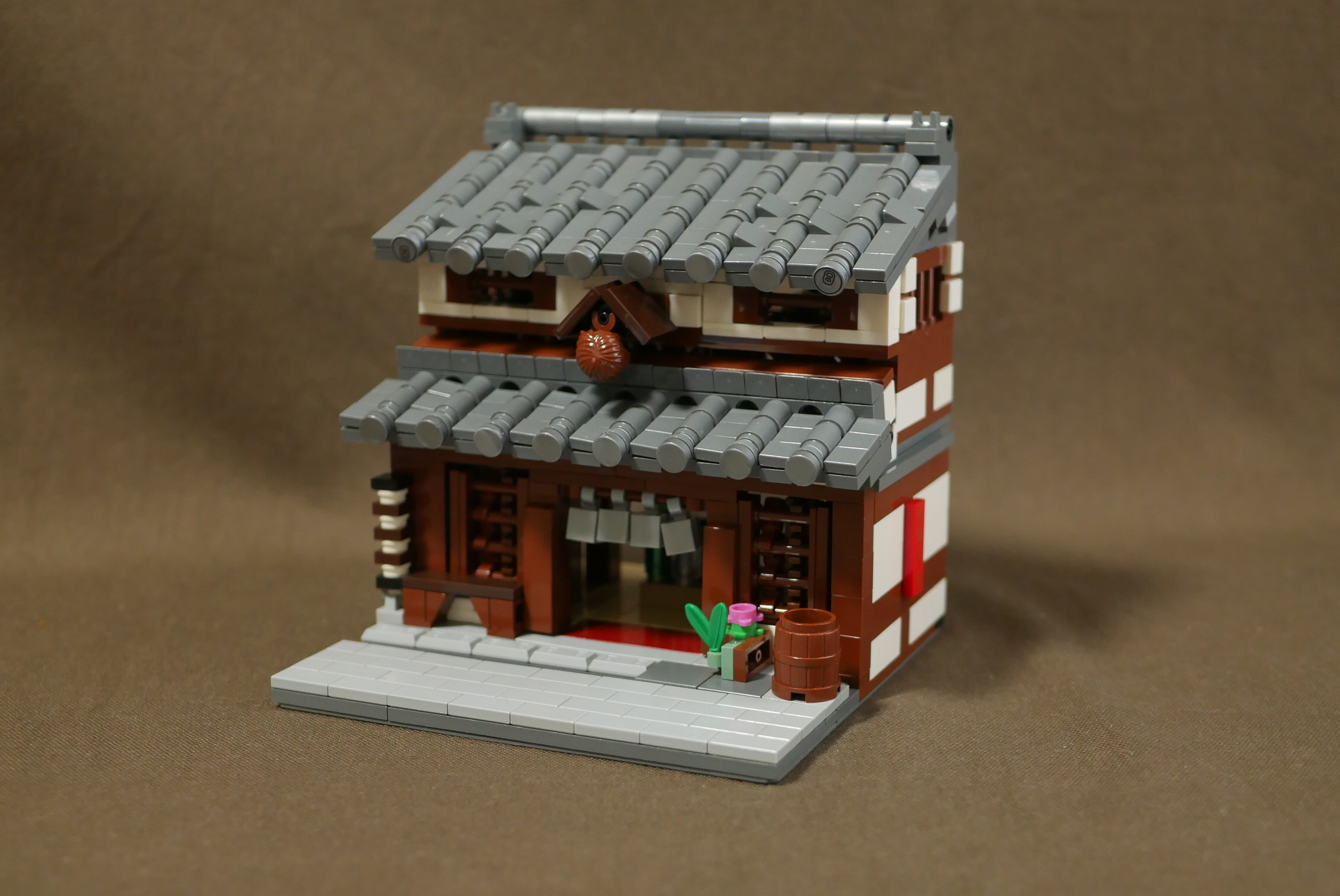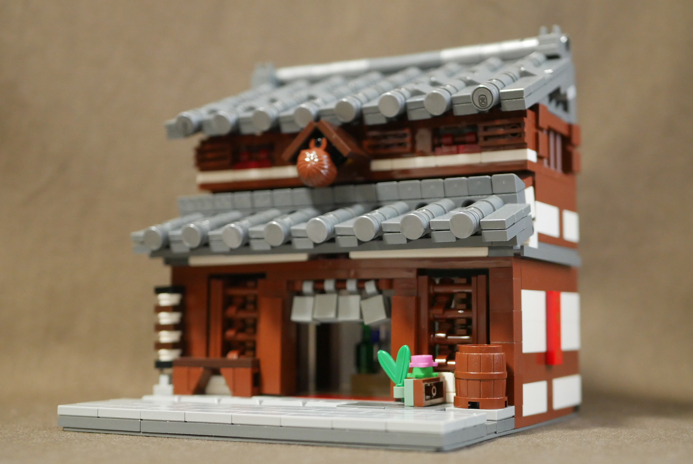 制作期間1日。瓦屋根作りに少々時間がかかり、内装が手抜きなのが残念なところ。やはり1日は無理がありますね。昔見た高山の街にある酒屋をイメージしてつくってみました。オリジナルなので実在はしません。町並みの一角にあるという設定なので、サイドは平面。本当はたくさん建物を並べて4枚目の角度で写真を撮りたいところ。いつか実現させたいですね。
