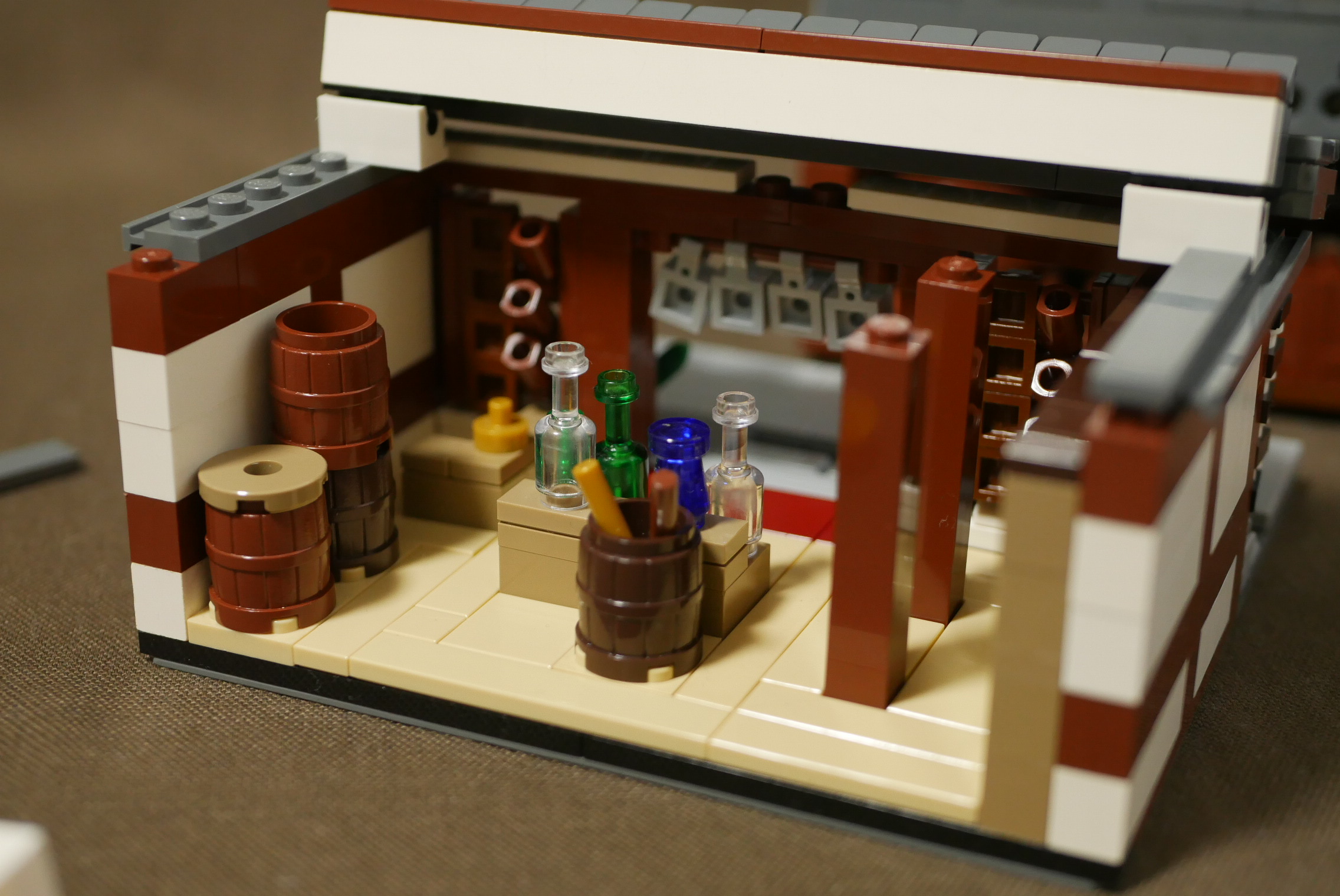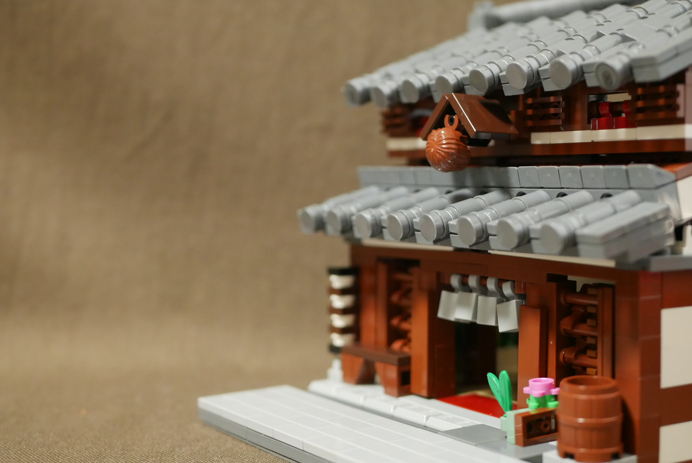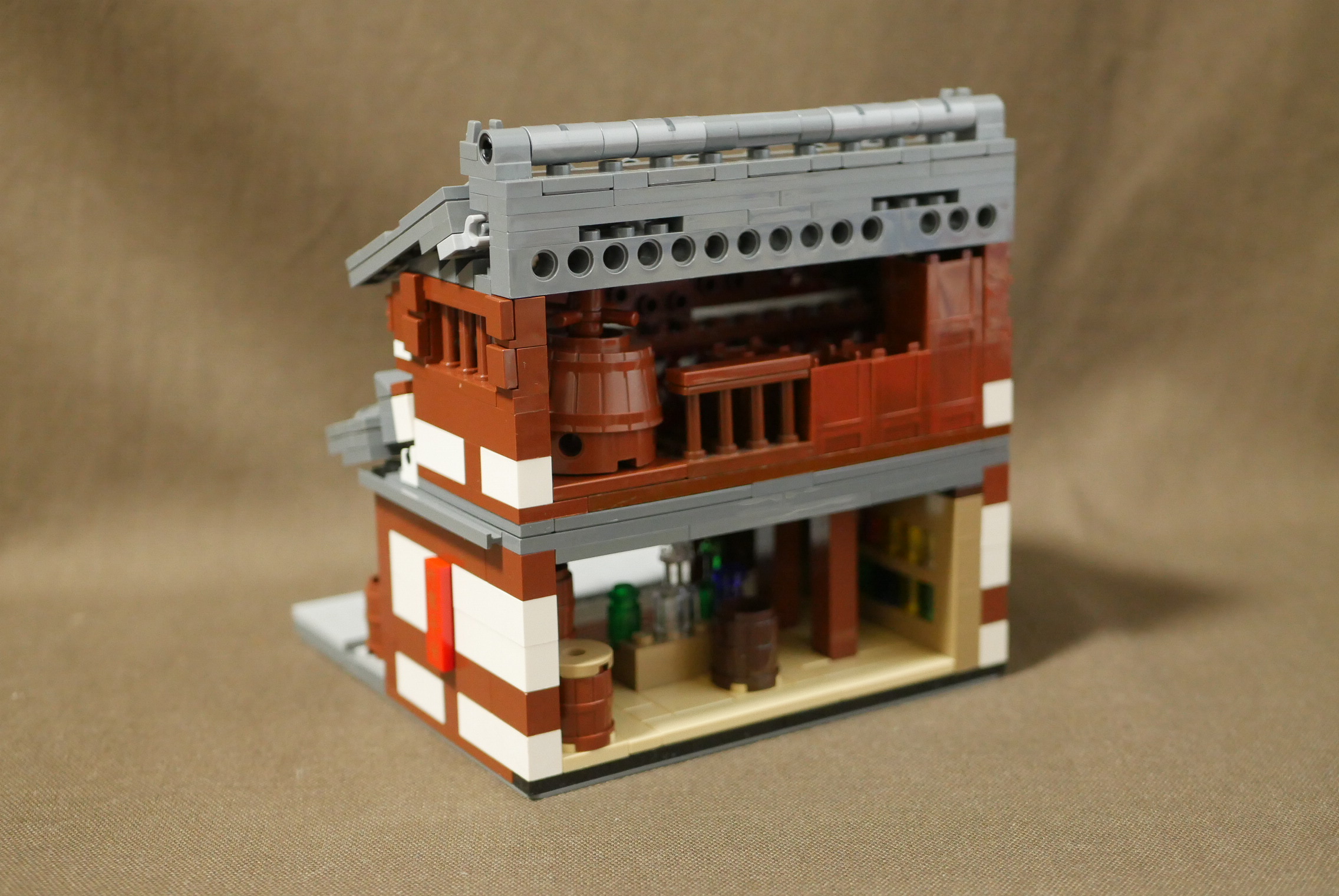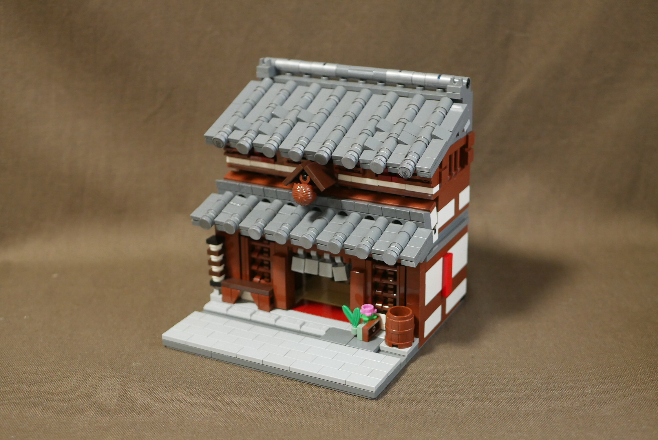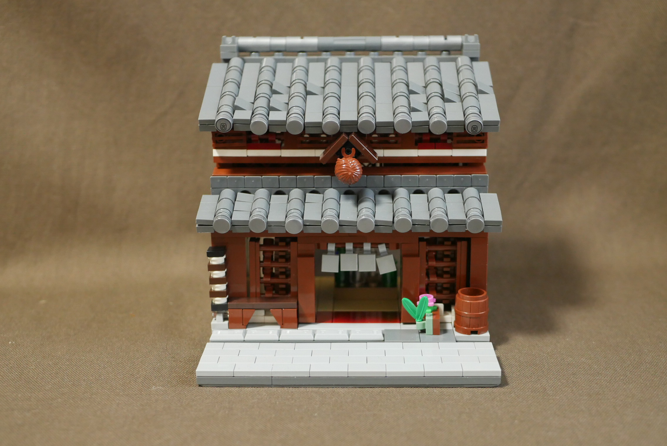 制作期間1日。瓦屋根作りに少々時間がかかり、内装が手抜きなのが残念なところ。やはり1日は無理がありますね。昔見た高山の街にある酒屋をイメージしてつくってみました。オリジナルなので実在はしません。町並みの一角にあるという設定なので、サイドは平面。本当はたくさん建物を並べて4枚目の角度で写真を撮りたいところ。いつか実現させたいですね。