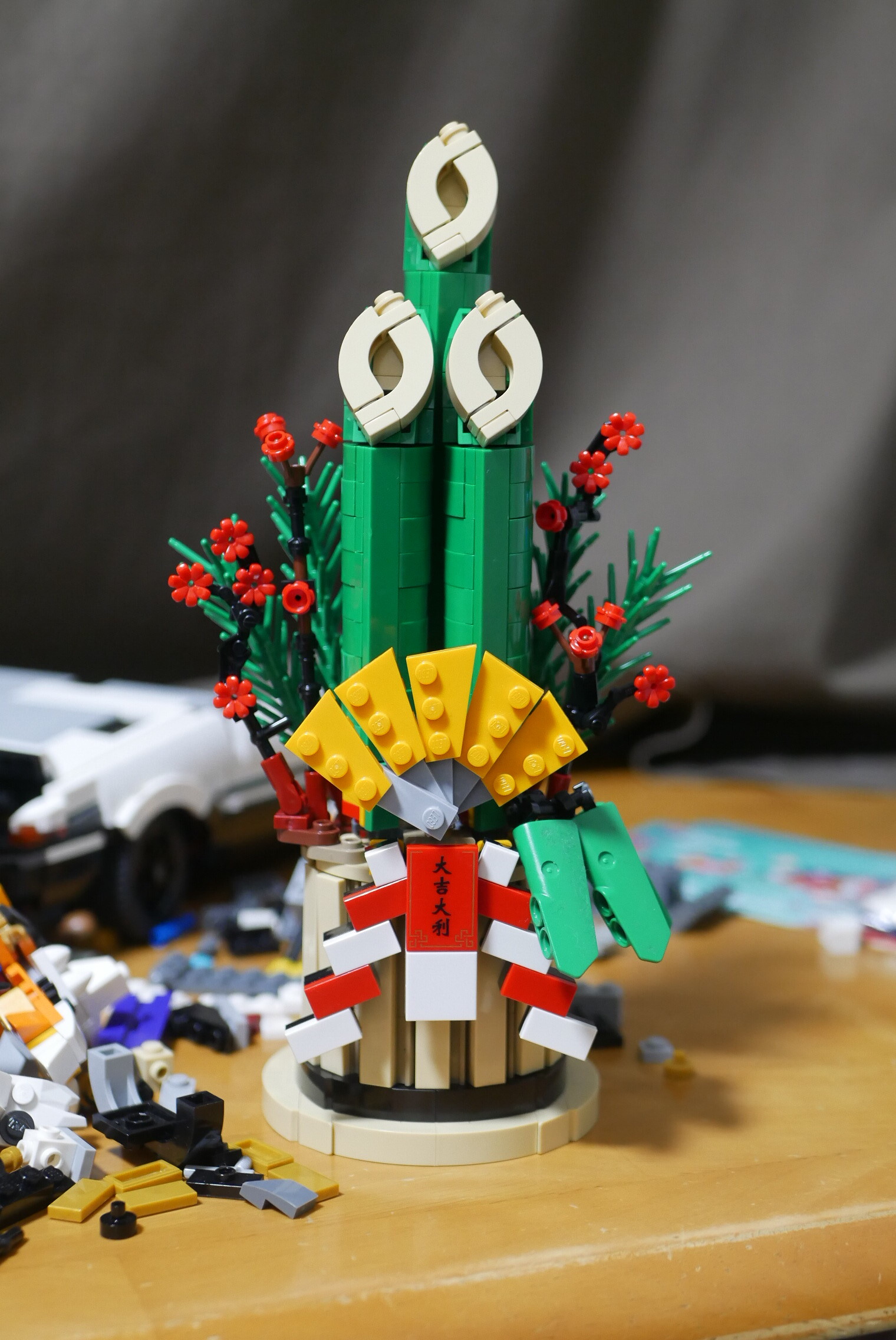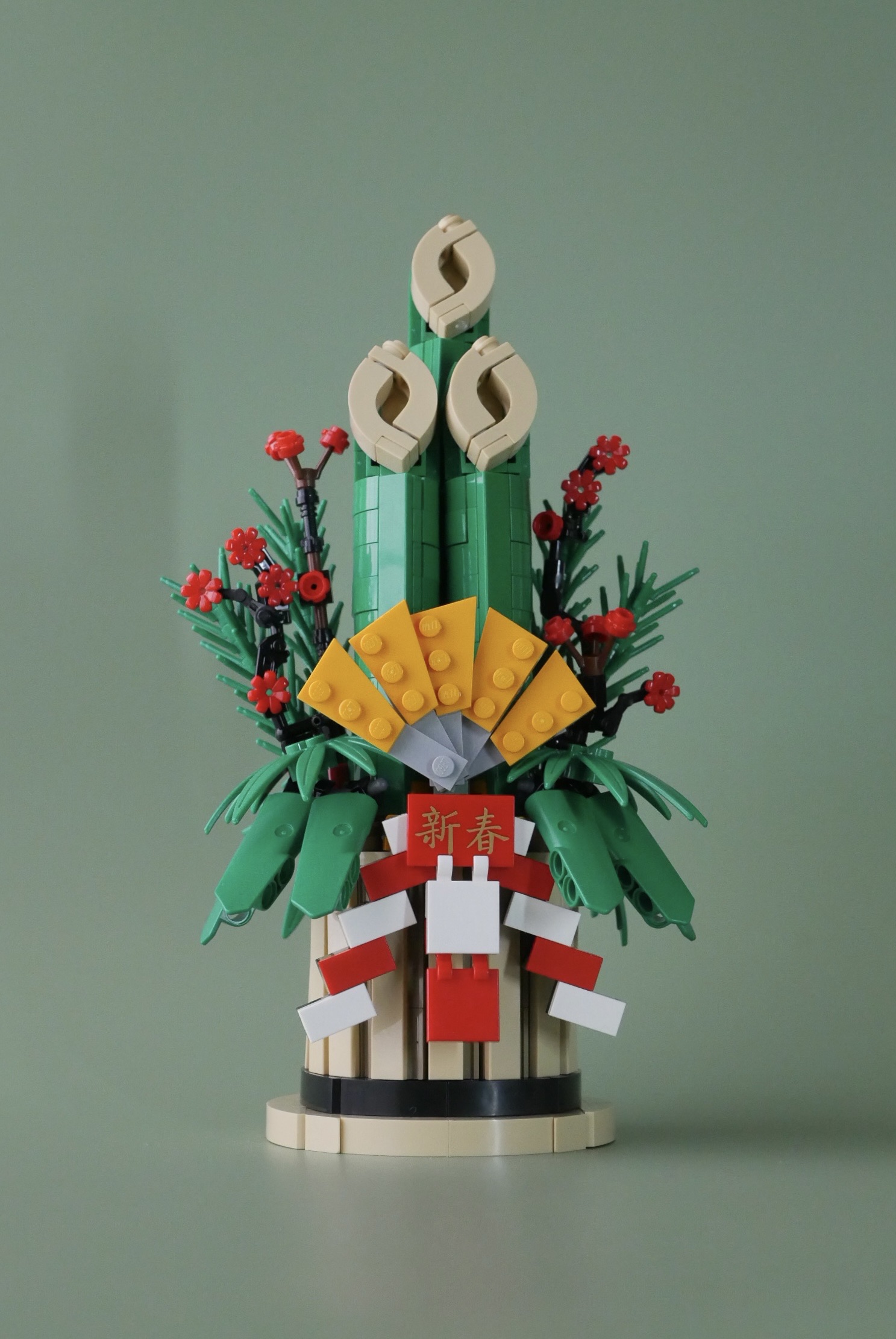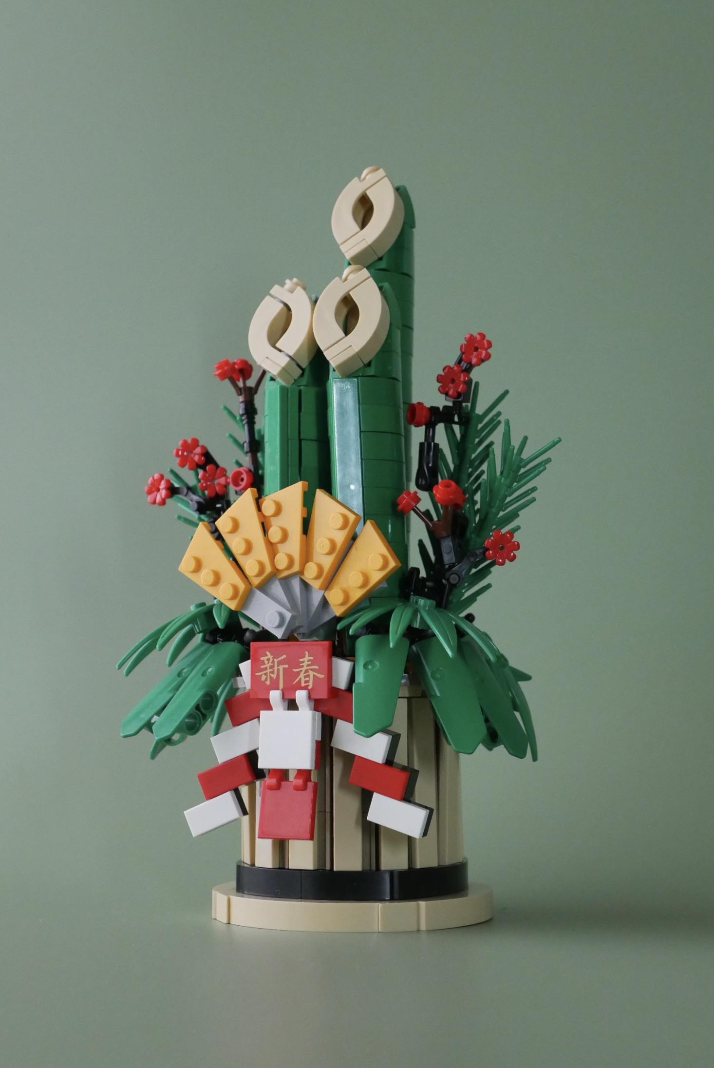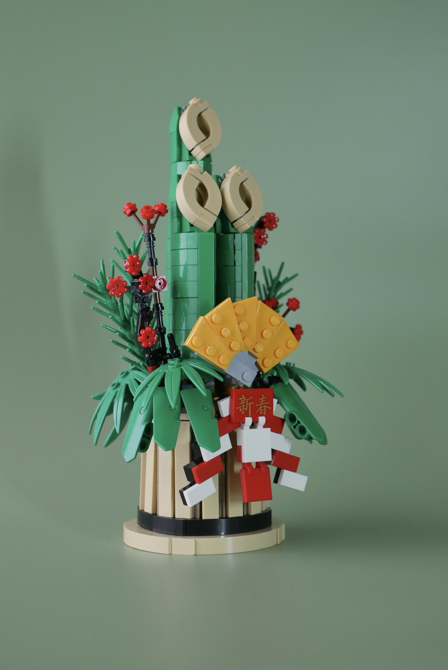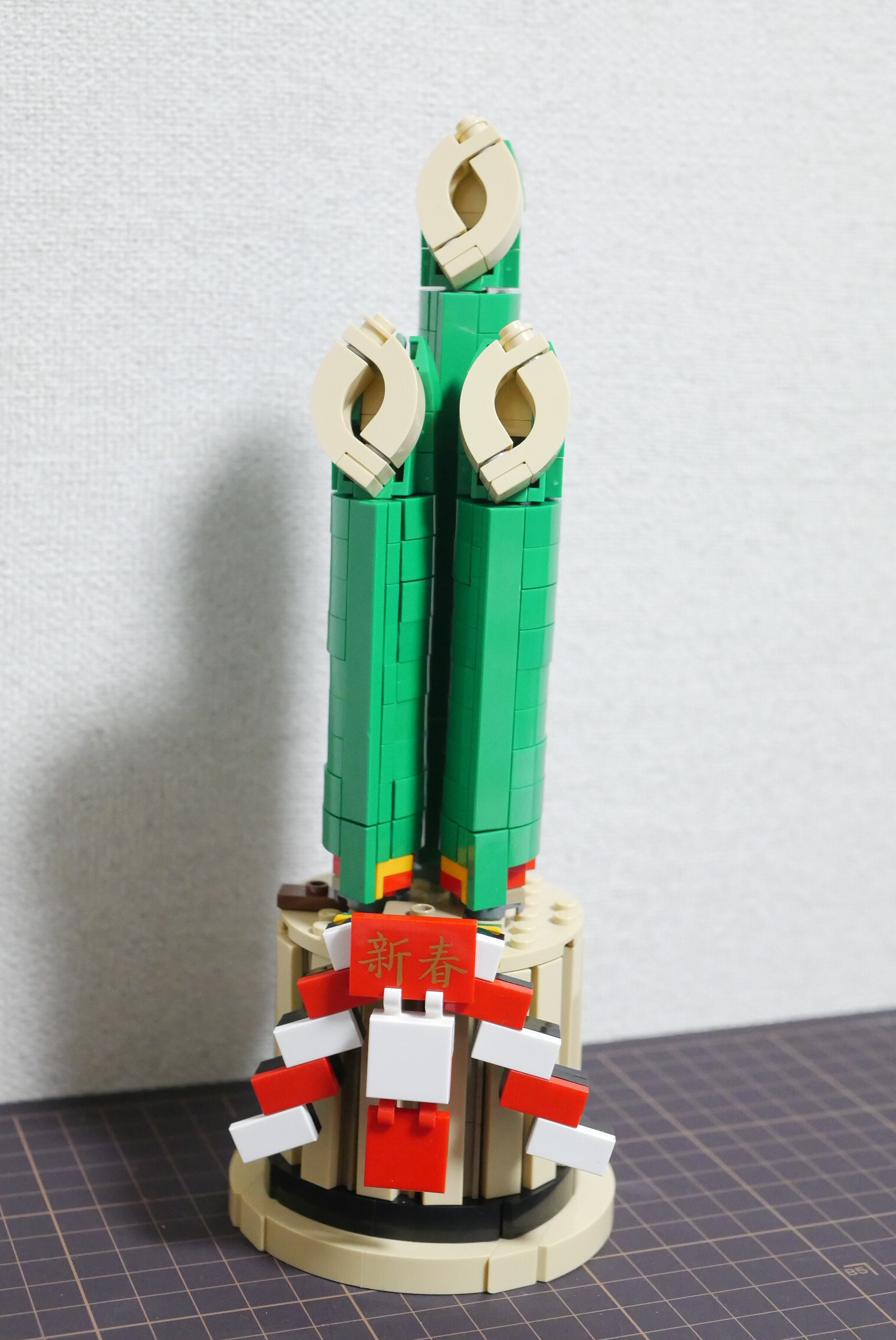 土台部分。ちょうど直径8ポッチのまわりを1×6タイルが囲っています。「新春」の文字はアジアンフェスティバルのセットに付属していた純正プリントです。中国語だけど日本語としても使える。