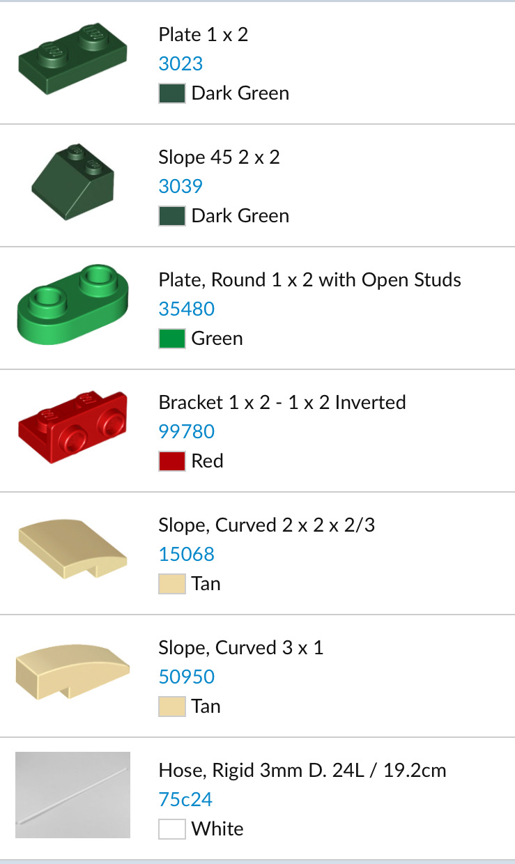 こちらは今作で100ピース以上使用したパーツ、つまり神龍を構成する大半を占めているパーツです。神龍の胴体は4色で作られていますが、1色当たり2種類ほどしか使用していないため注文が楽。最近作ったガンダムなんかは50種類以上のパーツを複数のセラーから買いましたが、今作はホース以外を同じセラーで一括注文しました。注文したいロット数が少ないほど全て取り扱っているセラーが増え、送料や単価が安いセラーを厳選できます。