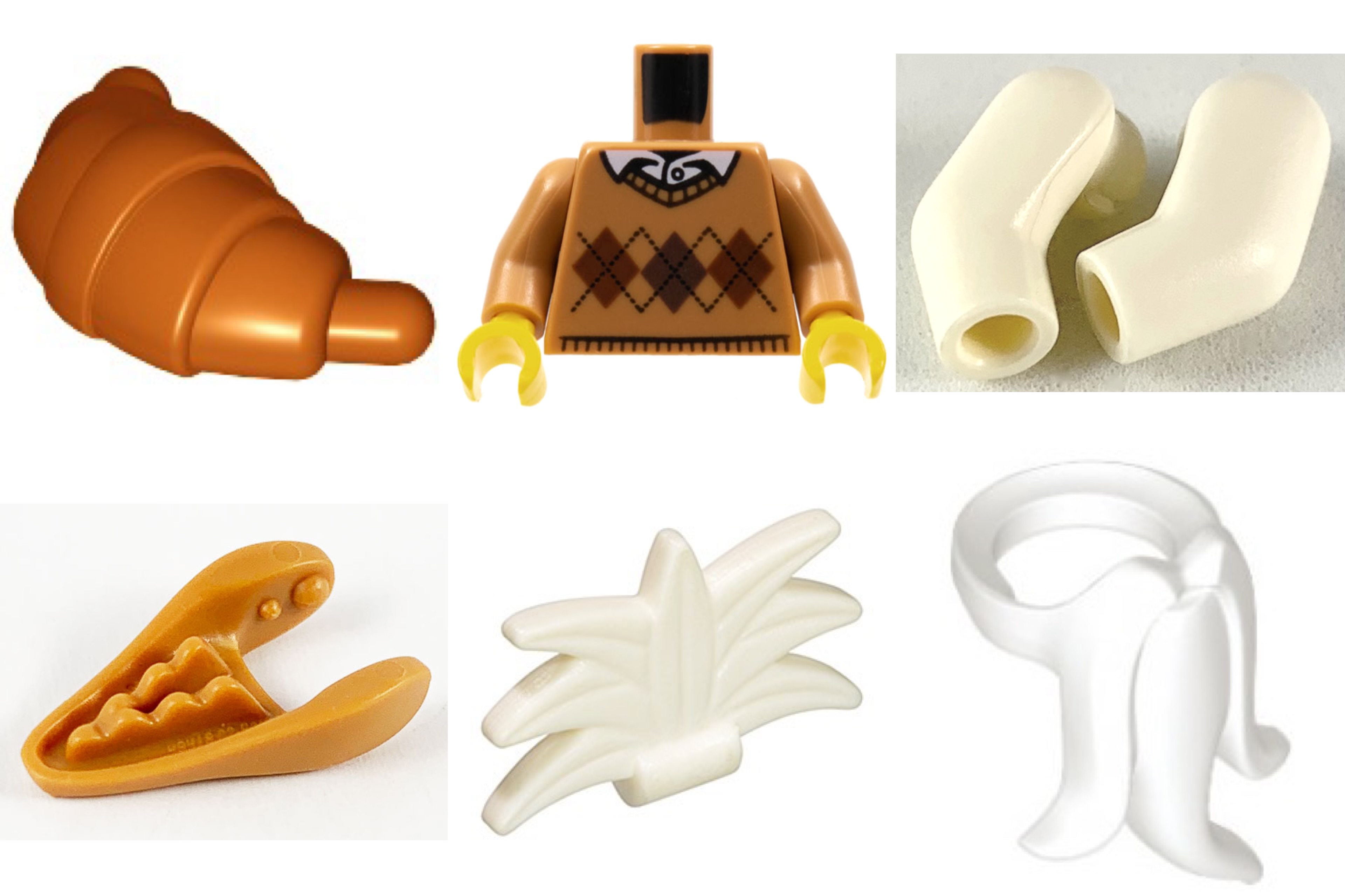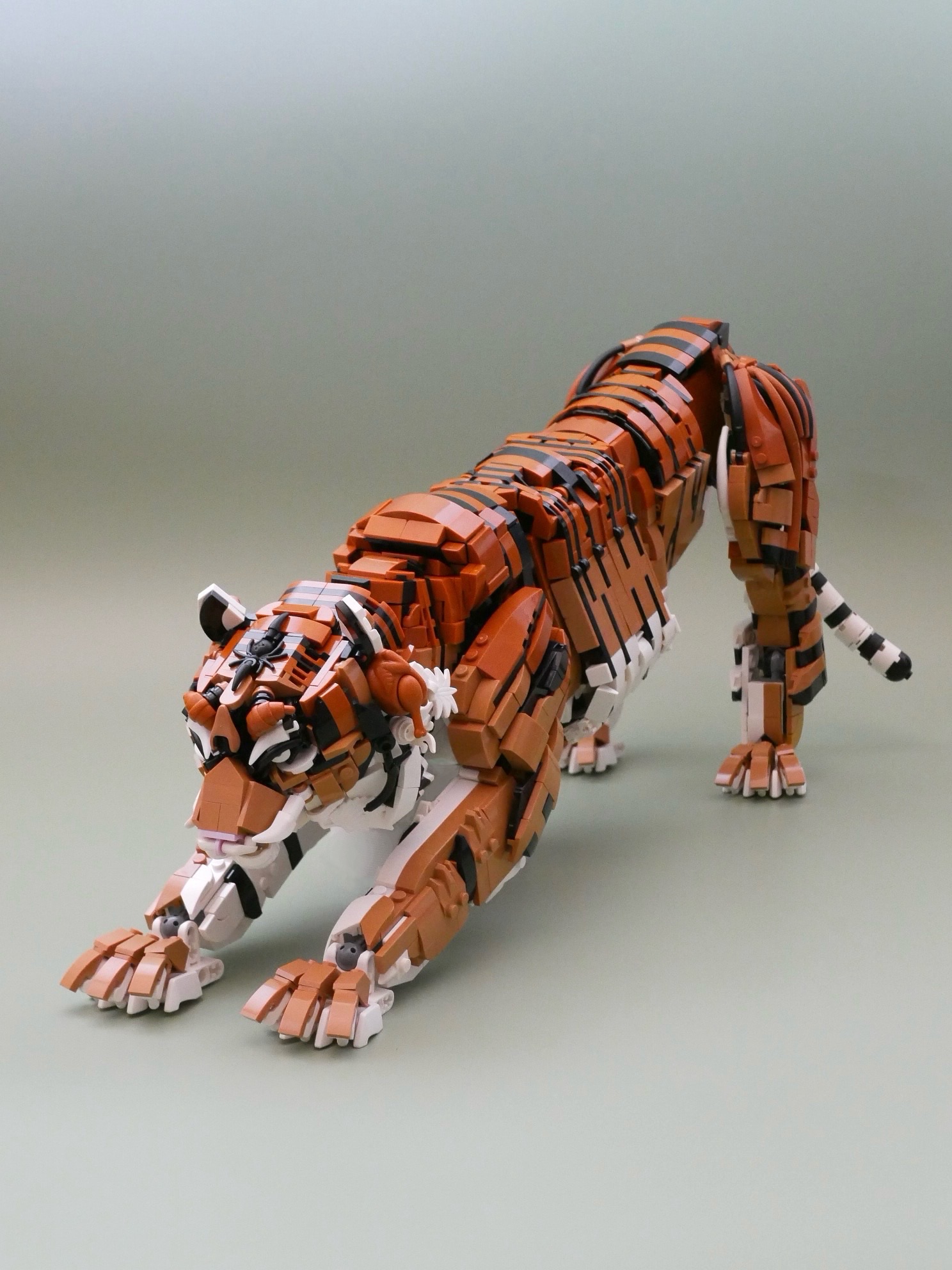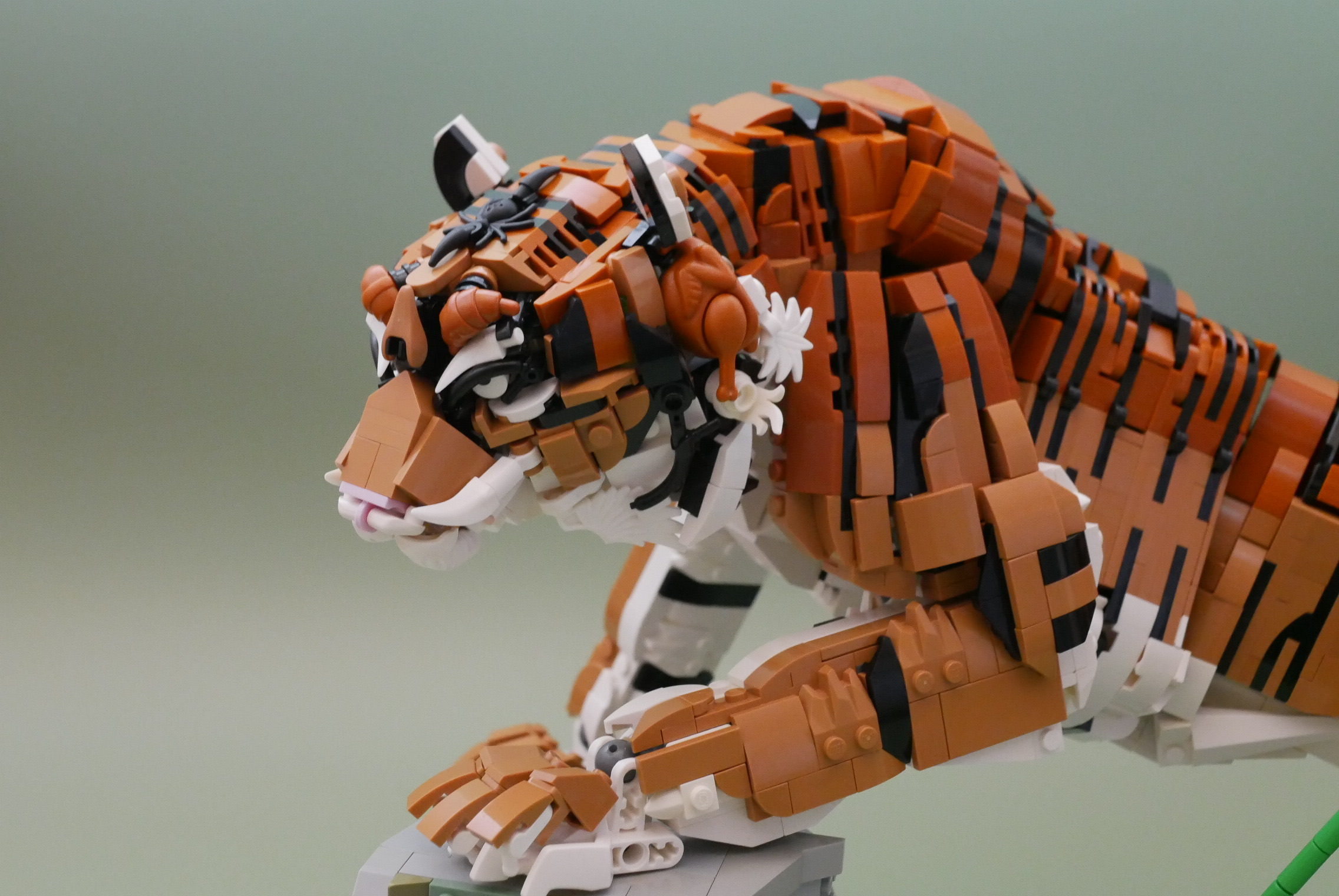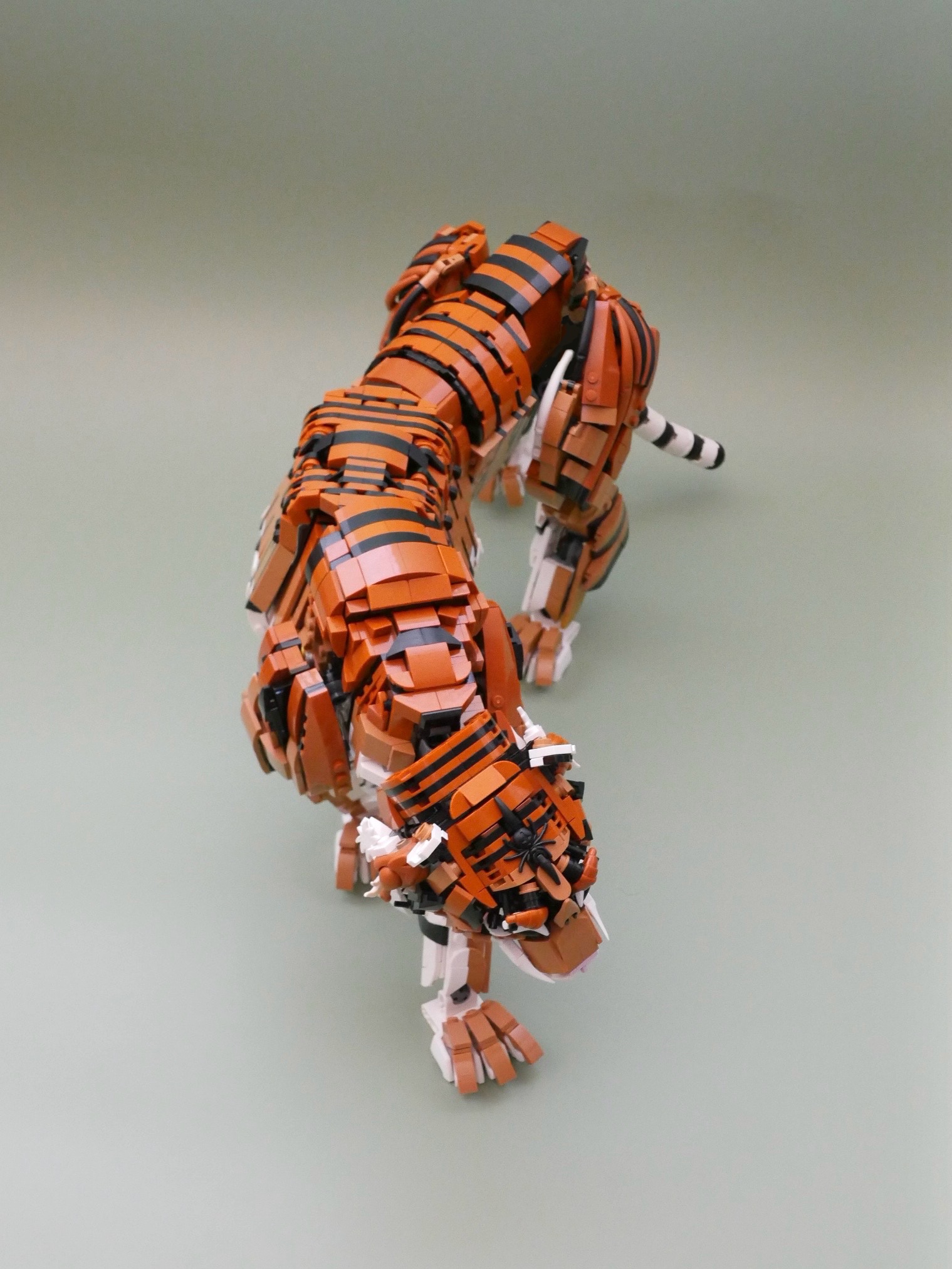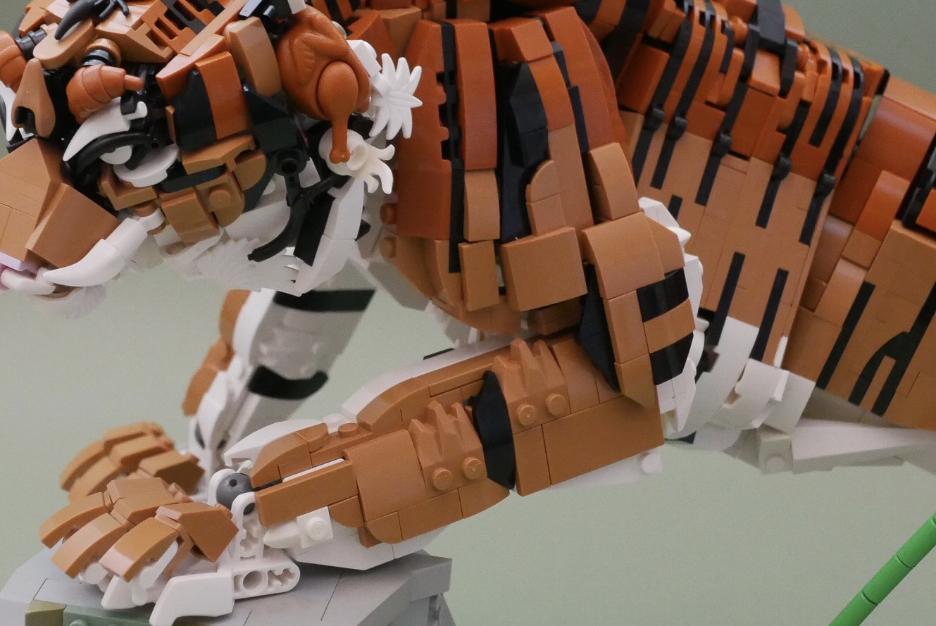 トラの模様を表現する際、1スタッド幅の模様では太すぎるという理由から、プレート幅での模様表現に決定。しかしスロープ、カーブスロープなど種類の豊富なスタッド幅とは違い、プレートでの曲線表面は限られています。また可動させるには内部を空洞にさせる必要があり、プレート幅であることと覆った形状であること双方に当てはまるマカロニが最適だと考えました。