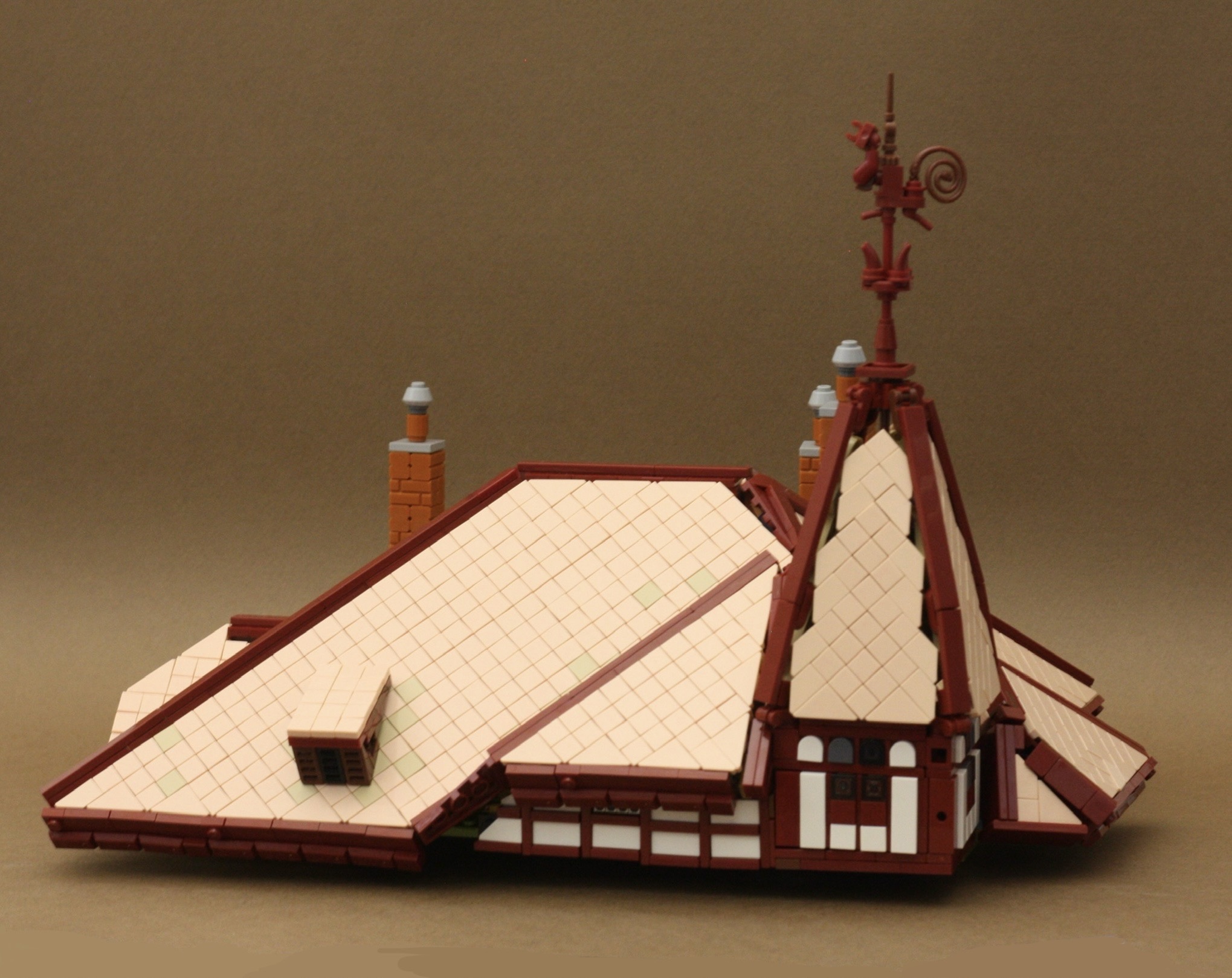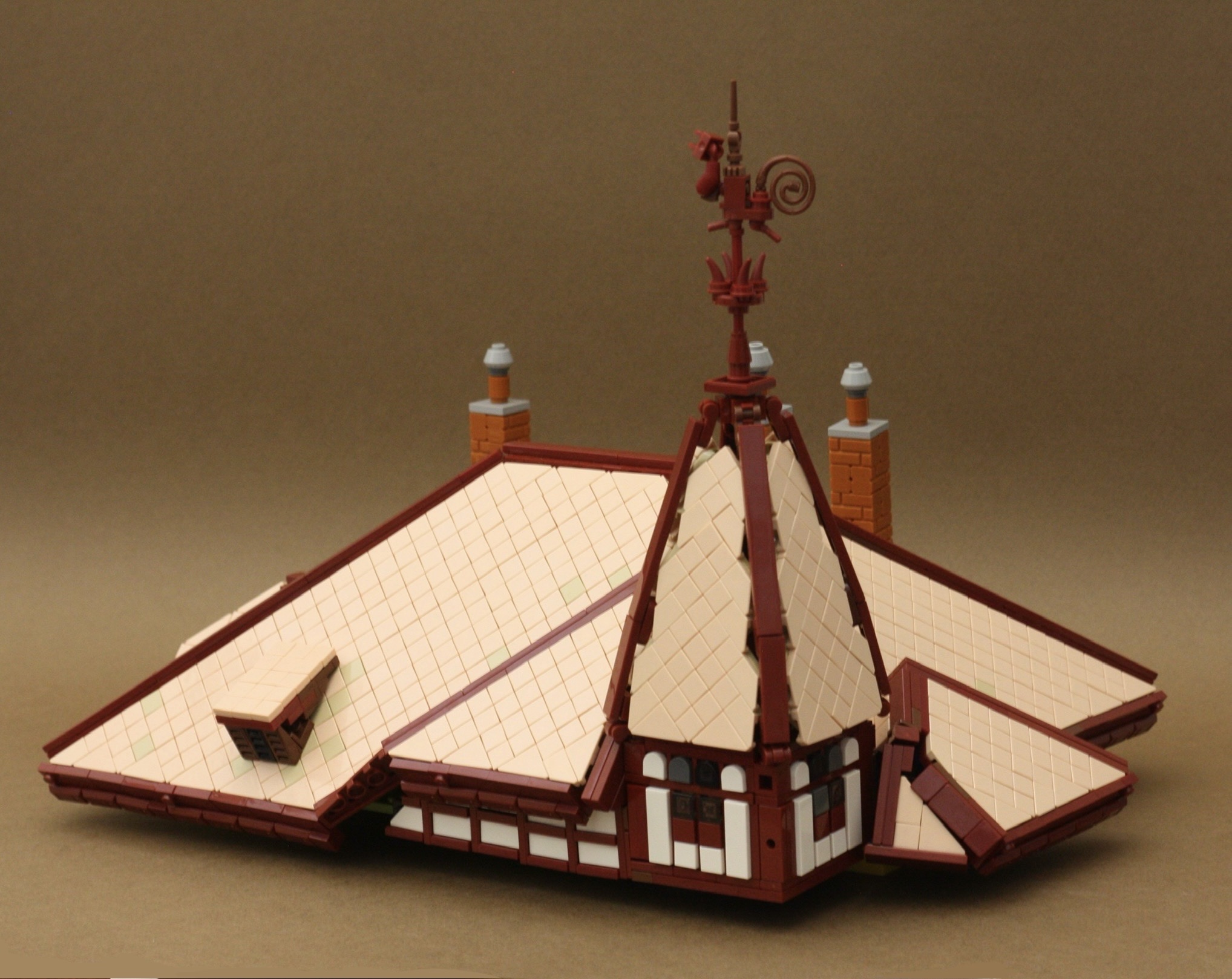 これはレゴランドのミニランドエリアにあるレゴ風見鶏の館。レンガがダークレッド、木材が茶色、屋根がタンで構成されていました。
