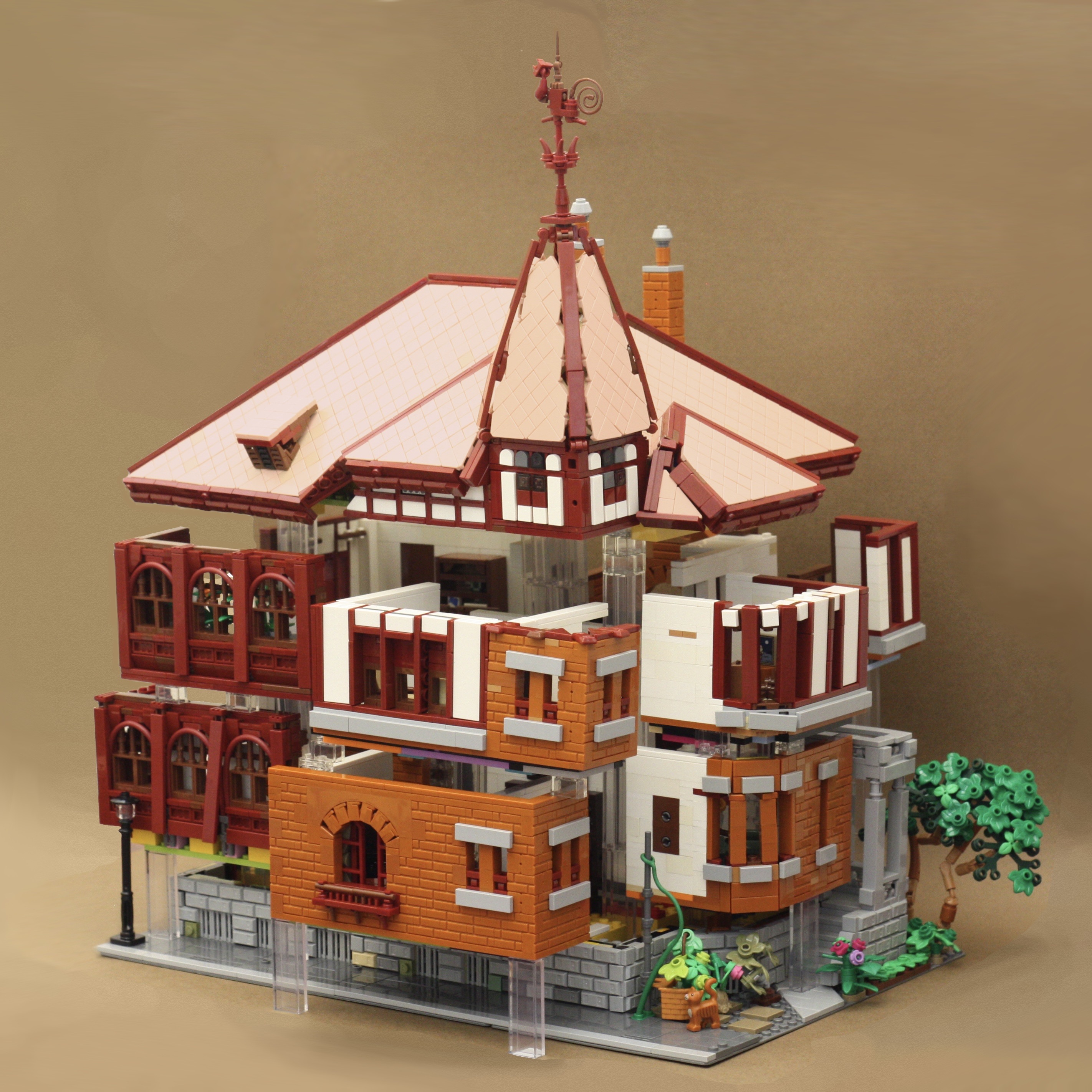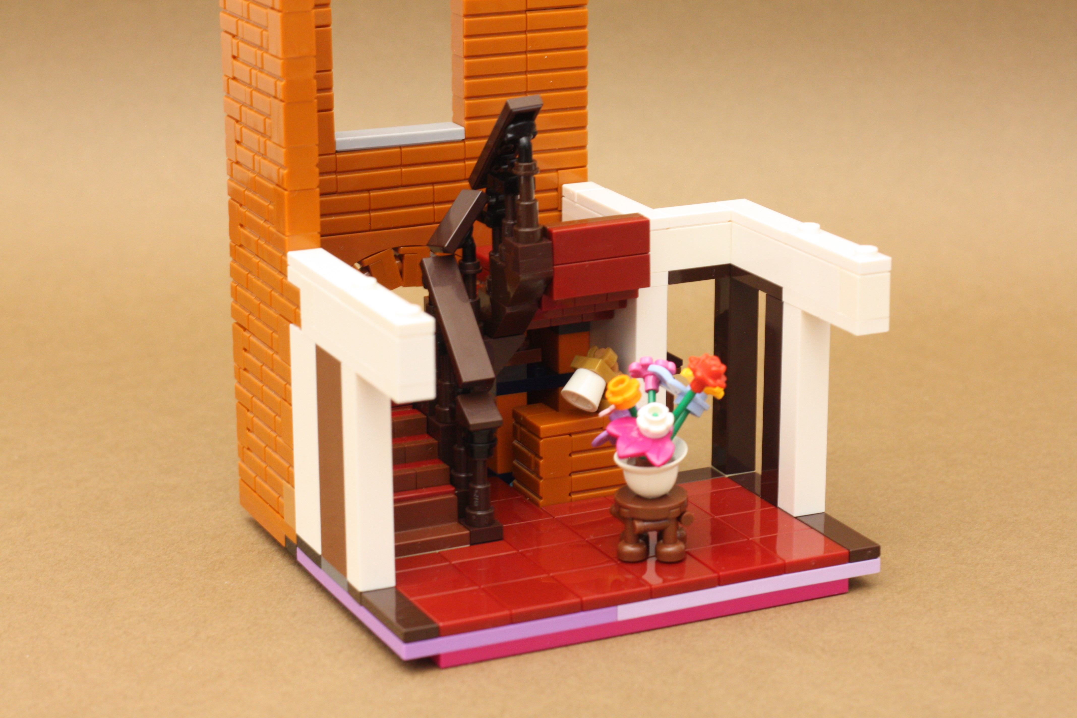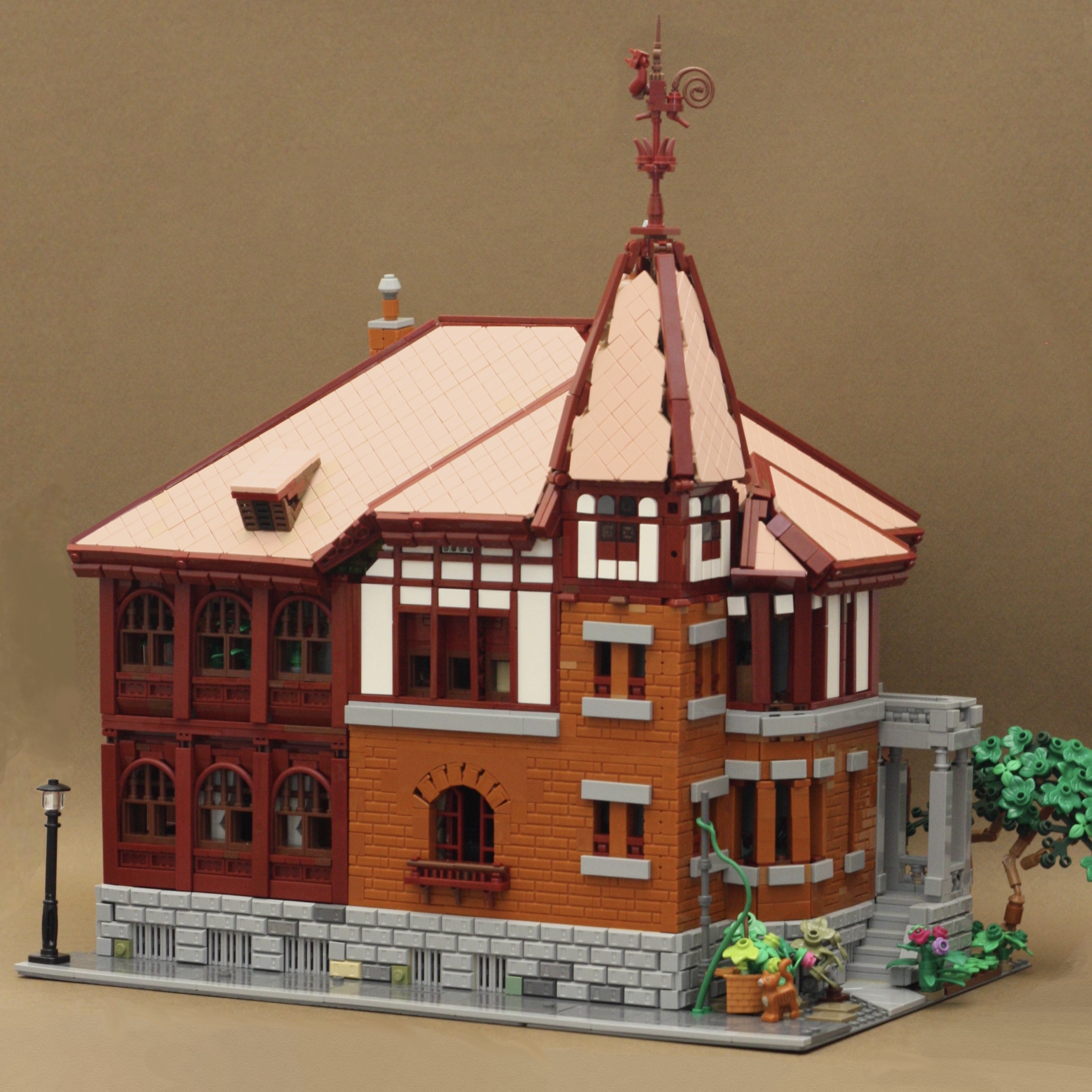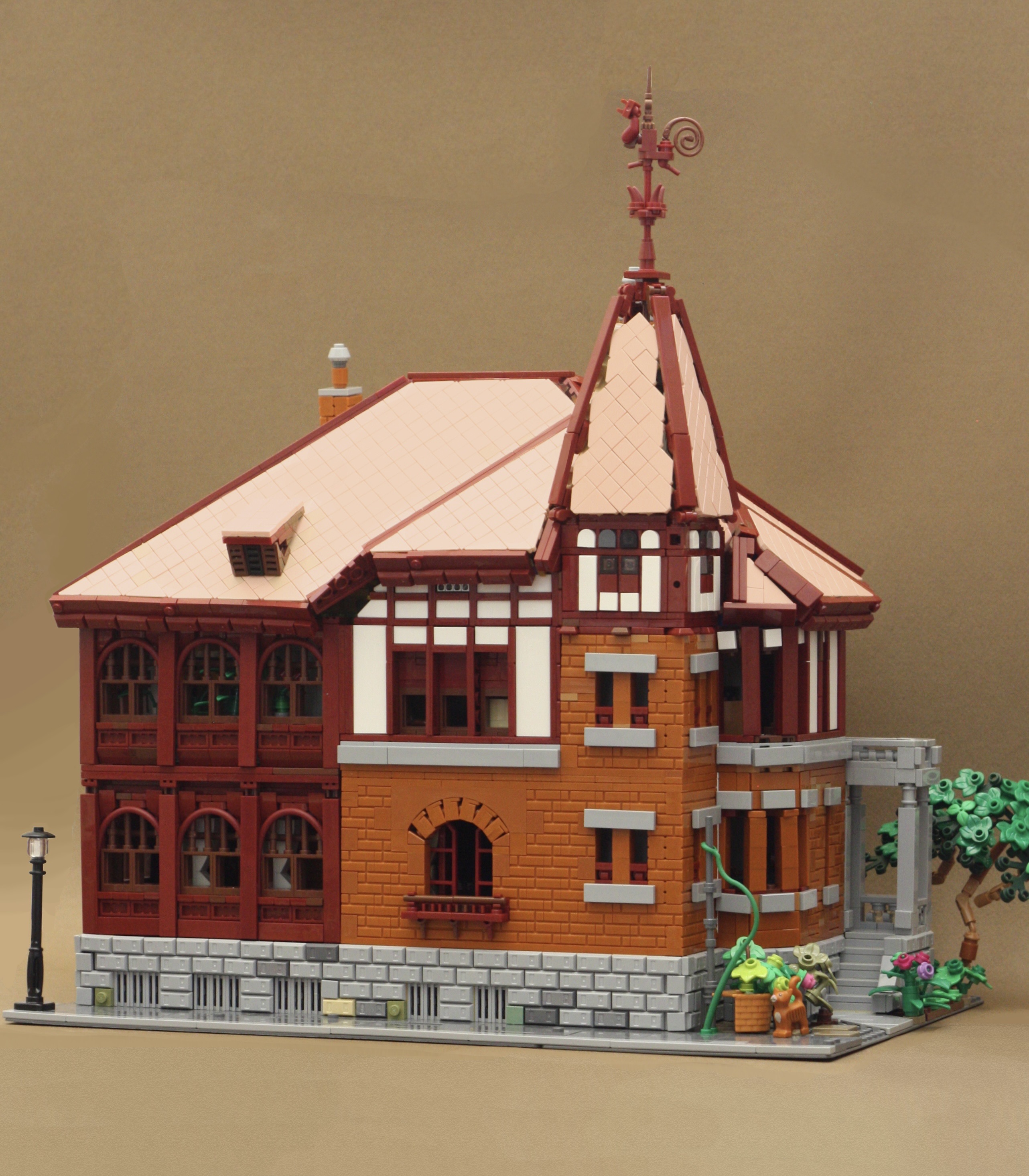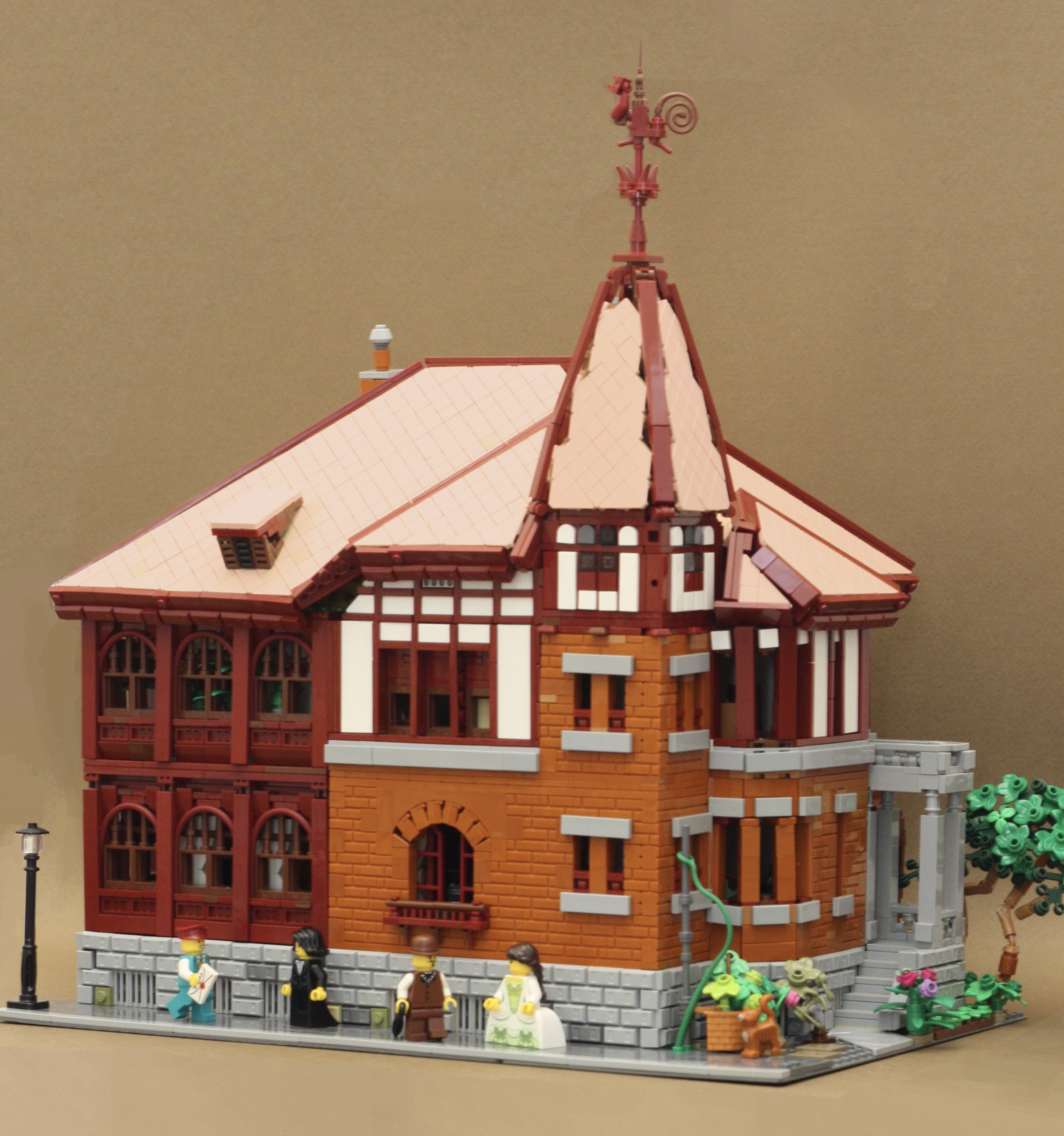 問題は奥行きが固定であったこと。32スタッドに4〜6スタッド分道路を設けなければならないので、実質建物の奥行きは26〜8スタッドでした。これを実際の風見鶏の館が収まるようにスケールを落とすとミニフィグに対してかなり小さくなります。