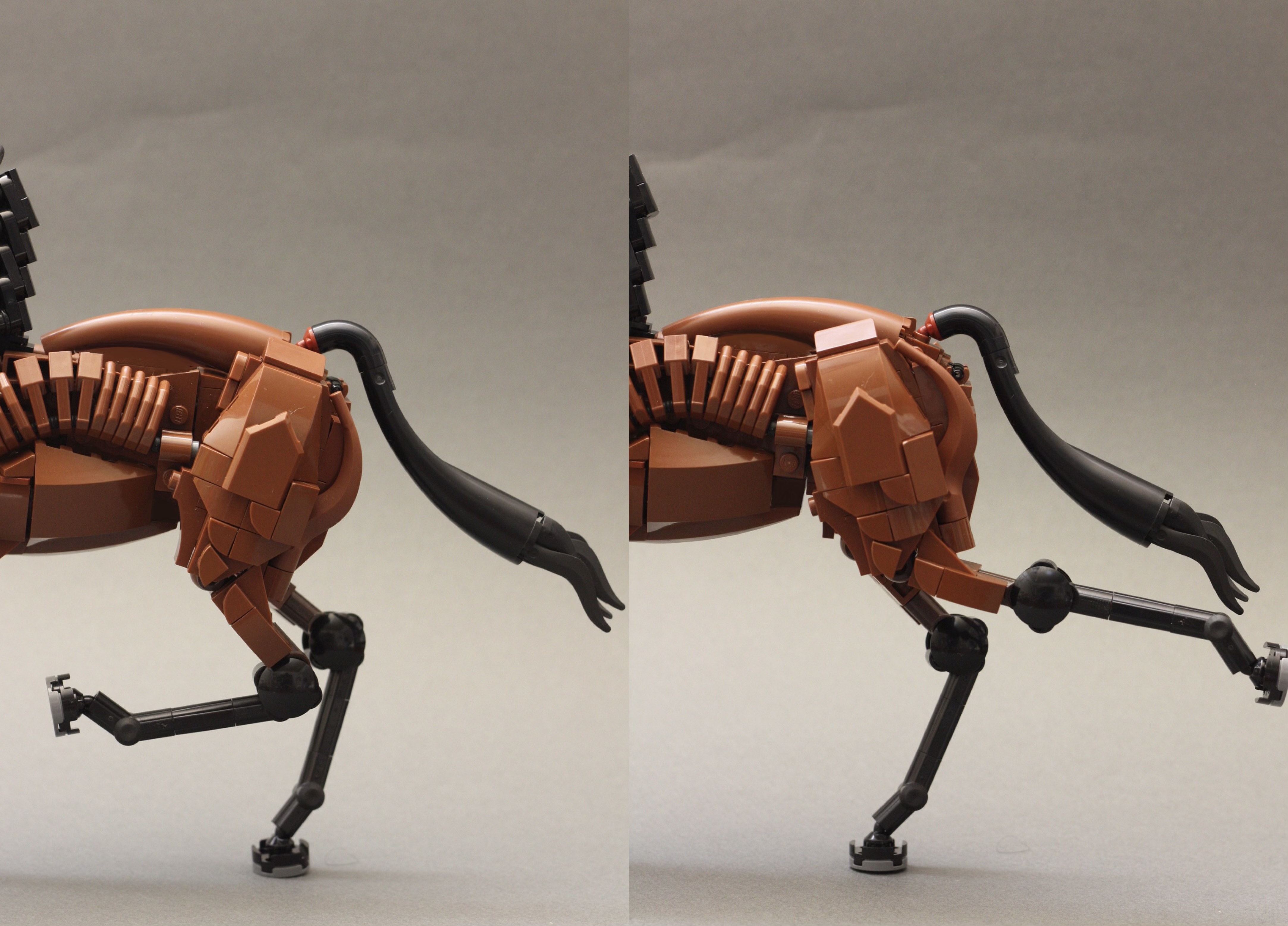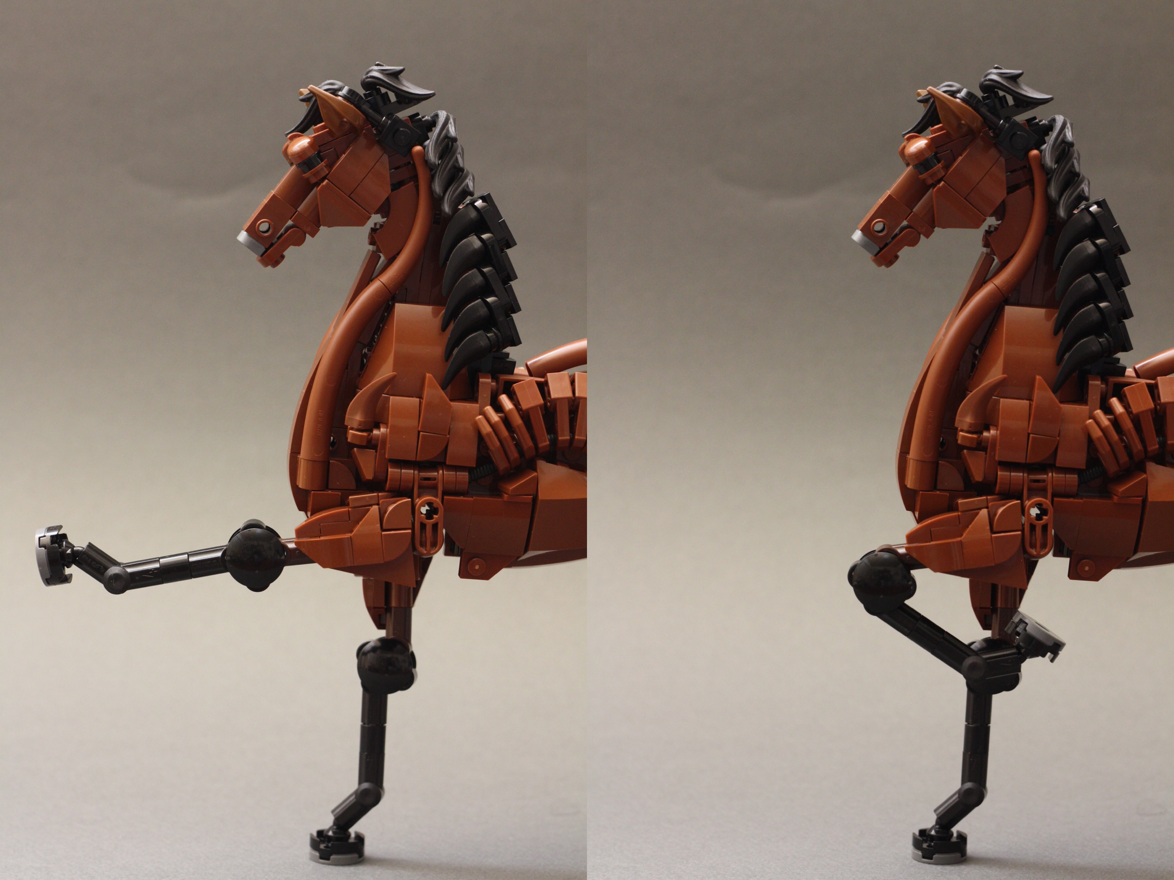 馬は脚が細いので、必然的に脚から上を軽くしないと自立しません。今回2足立ちもさせたかったので、いくら脚の関節の保持力が高くても大きければ安定しません。