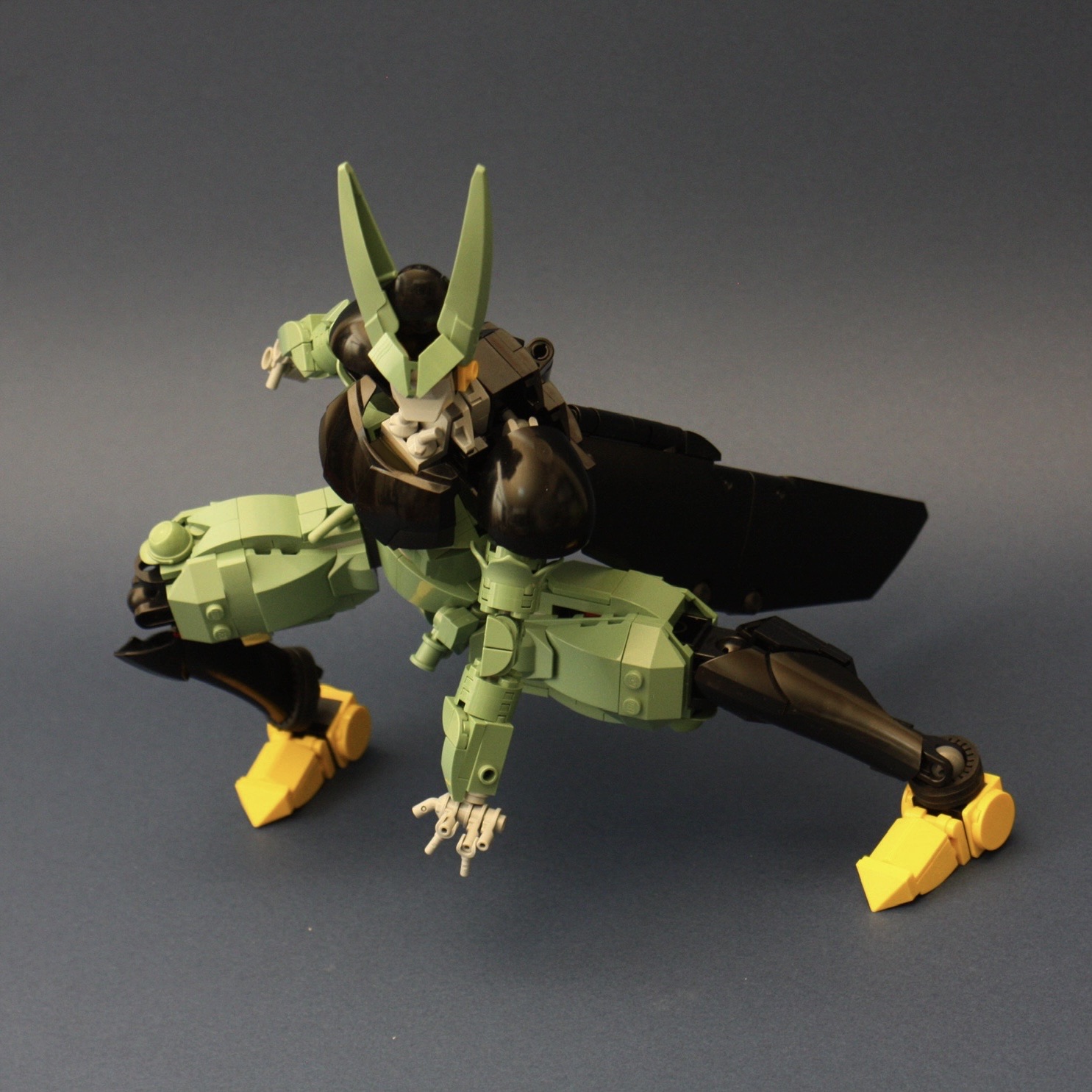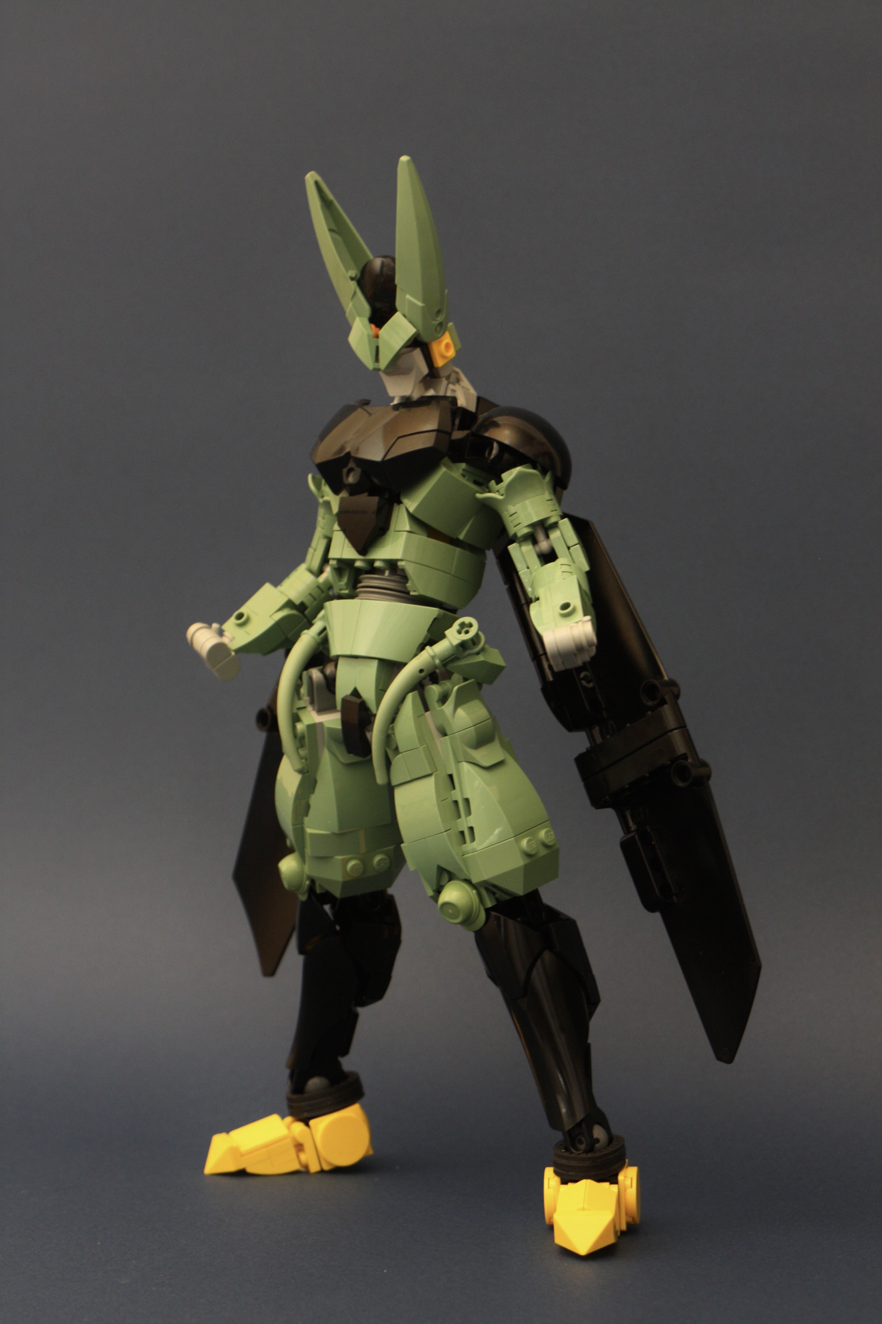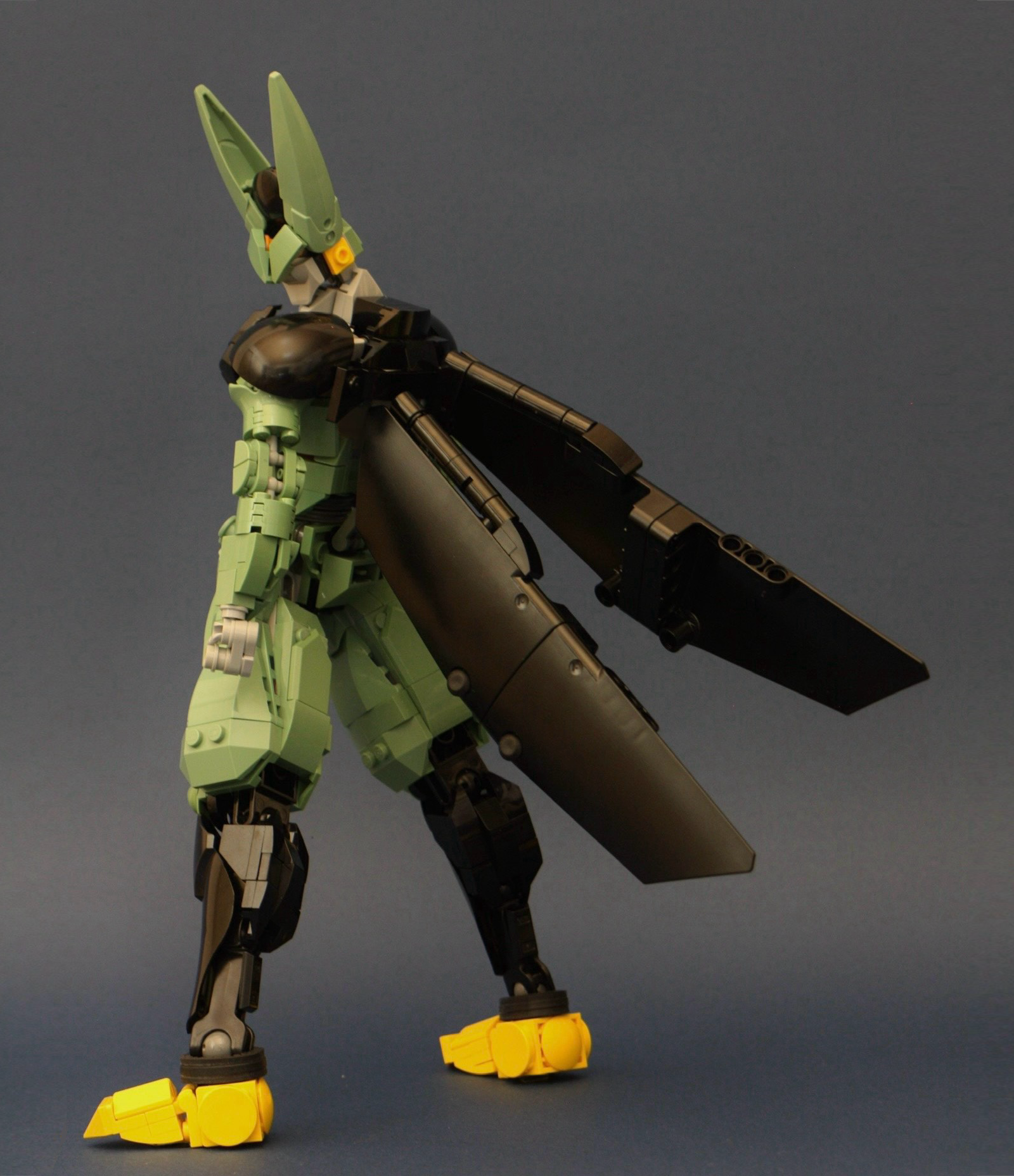 羽根は両側合わせて4枚のテクニックパネルというシンプルさですが、軽量化故の選択です。あと肘の外側。1/4円タイルを使用しポッチ隠しを施しているのですが、本来ならかまぼこタイルがベストで、サンドグリーンも存在しているにもかかわらず、よく利用するセラーに無かったために断念。別セラーを利用するほど金に余裕がなかったもので…
